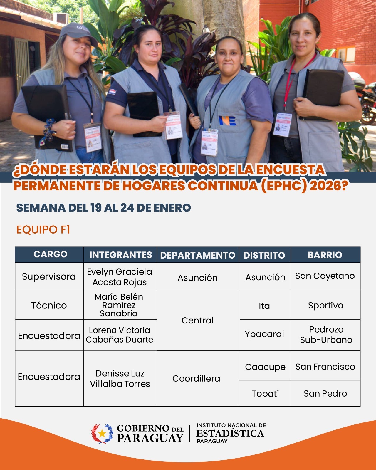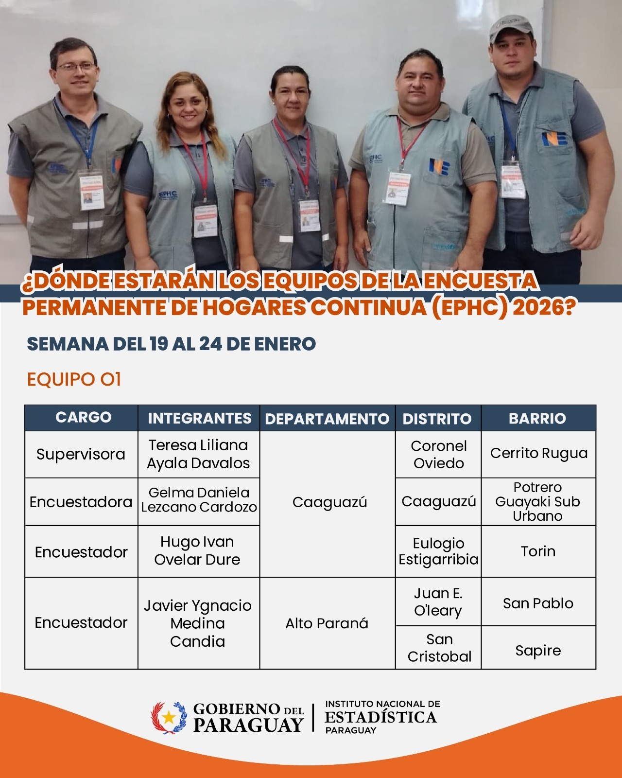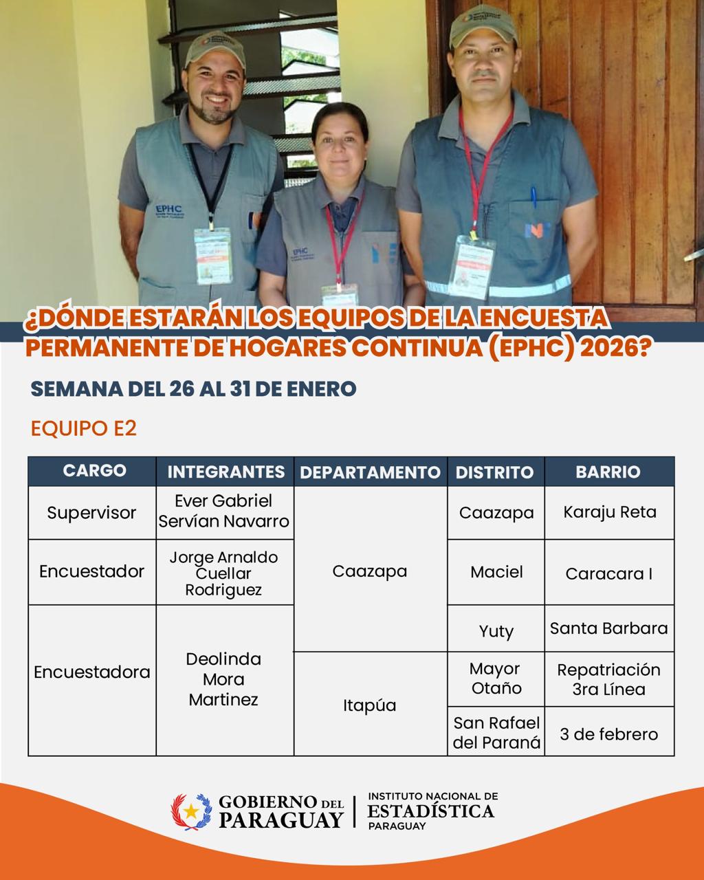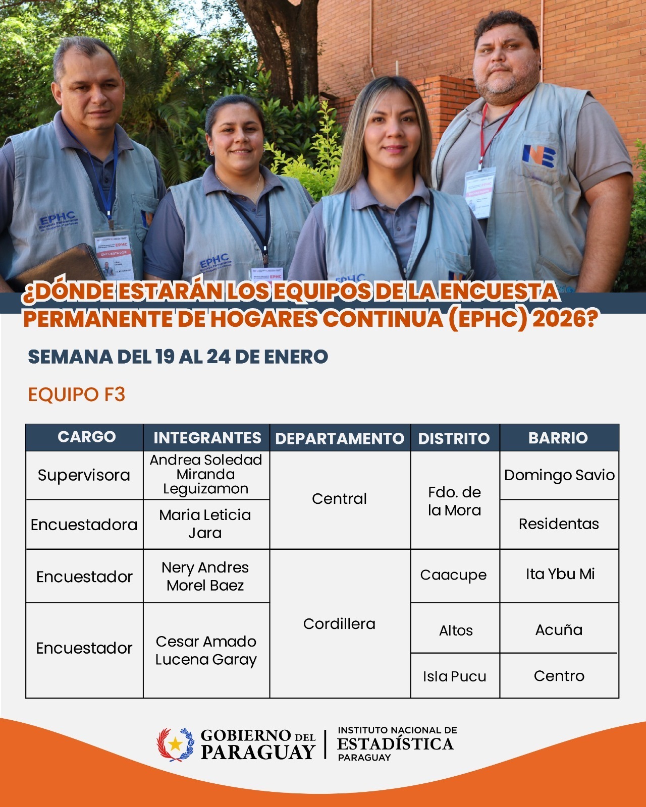 El Instituto Nacional de Estadística (INE) inició el operativo de campo para la recolección de datos del primer trimestre de la Encuesta Permanente de Hogares Continua (EPHC) 2026, que abarca los meses de enero, febrero y marzo. Cabe mencionar que este operativo se realiza durante todo el año.