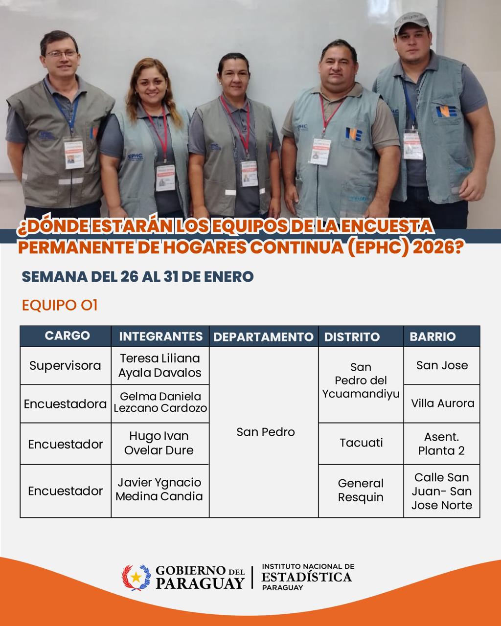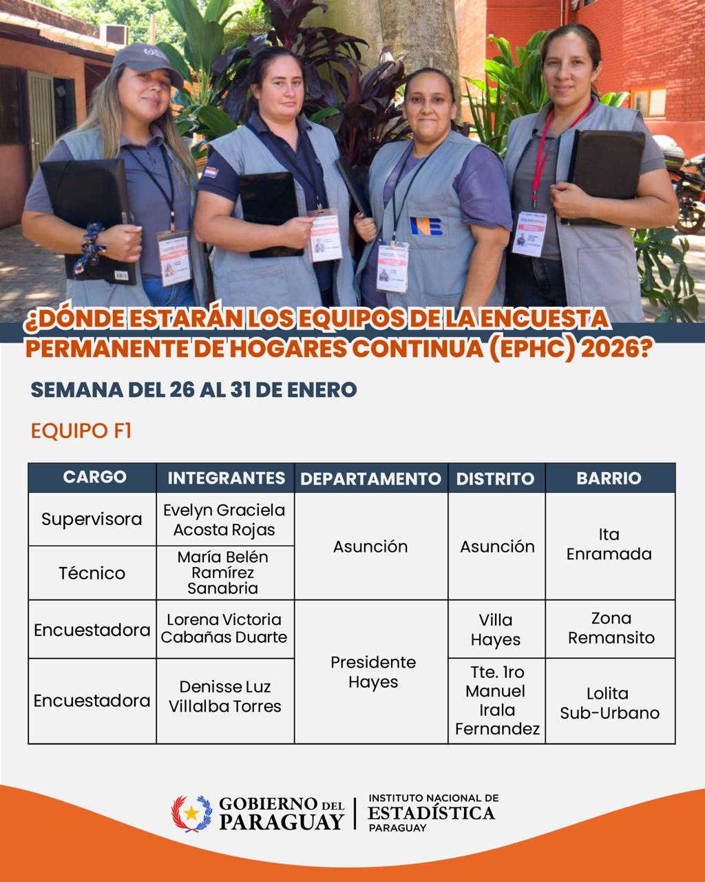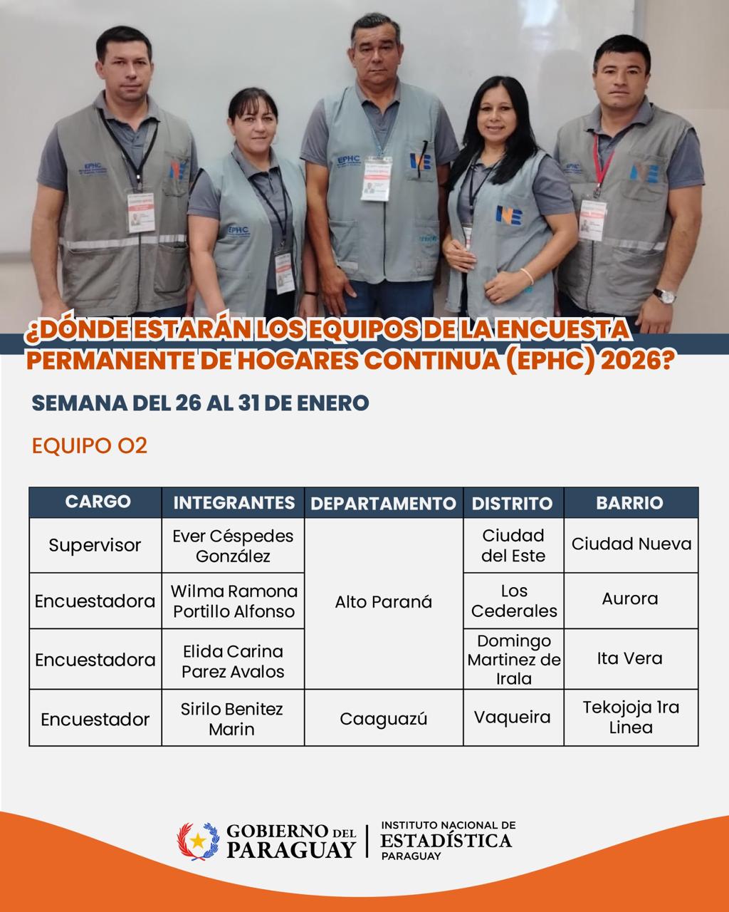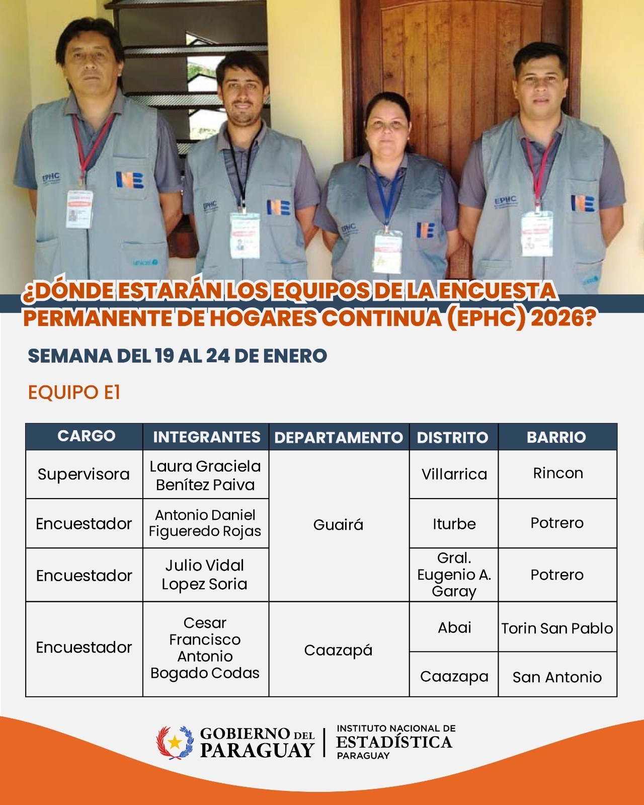 El Instituto Nacional de Estadística (INE) inició el operativo de campo para la recolección de datos del primer trimestre de la Encuesta Permanente de Hogares Continua (EPHC) 2026, que abarca los meses de enero, febrero y marzo. Cabe mencionar que este operativo se realiza durante todo el año.
