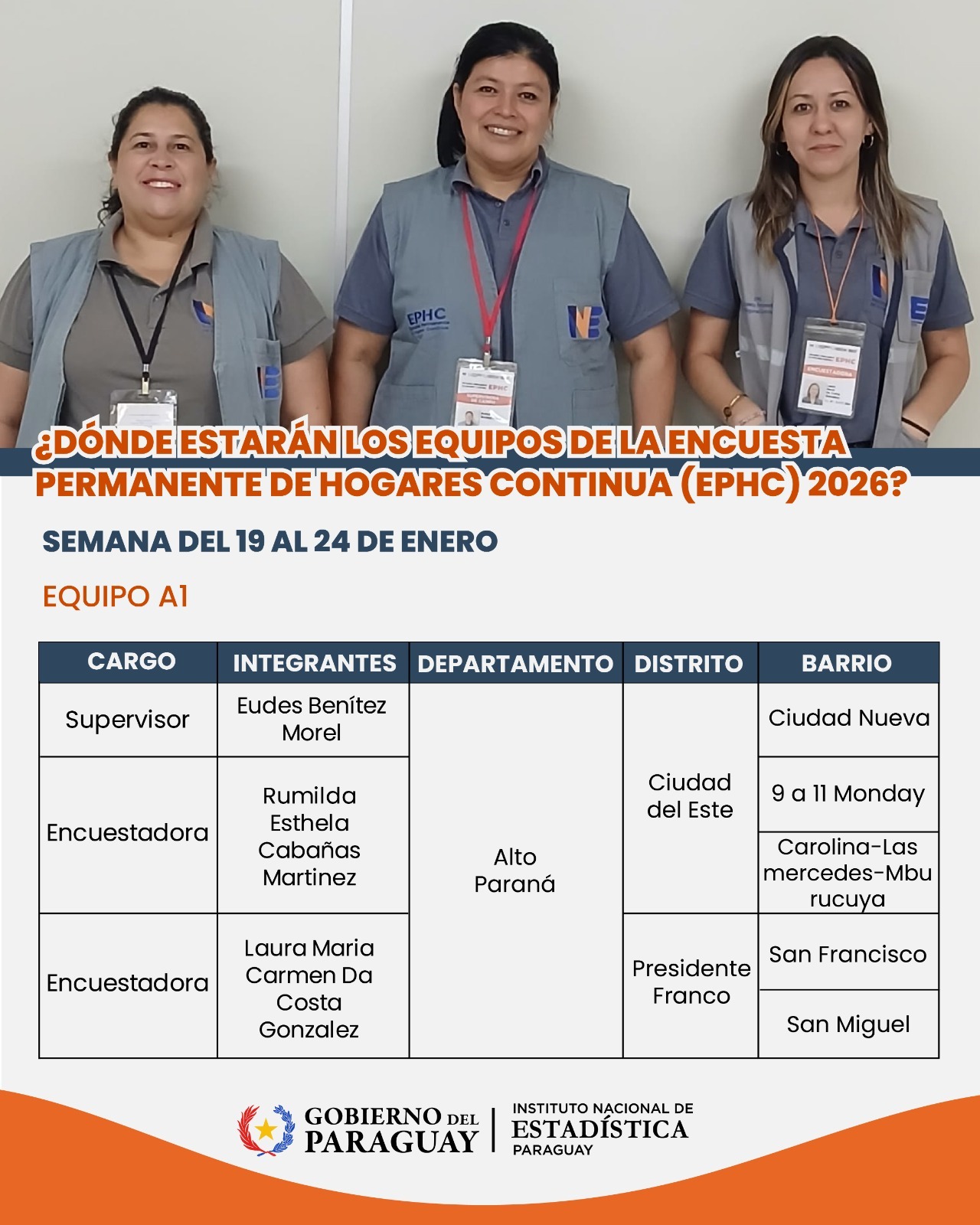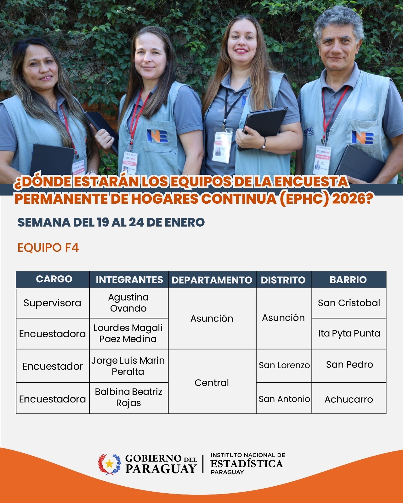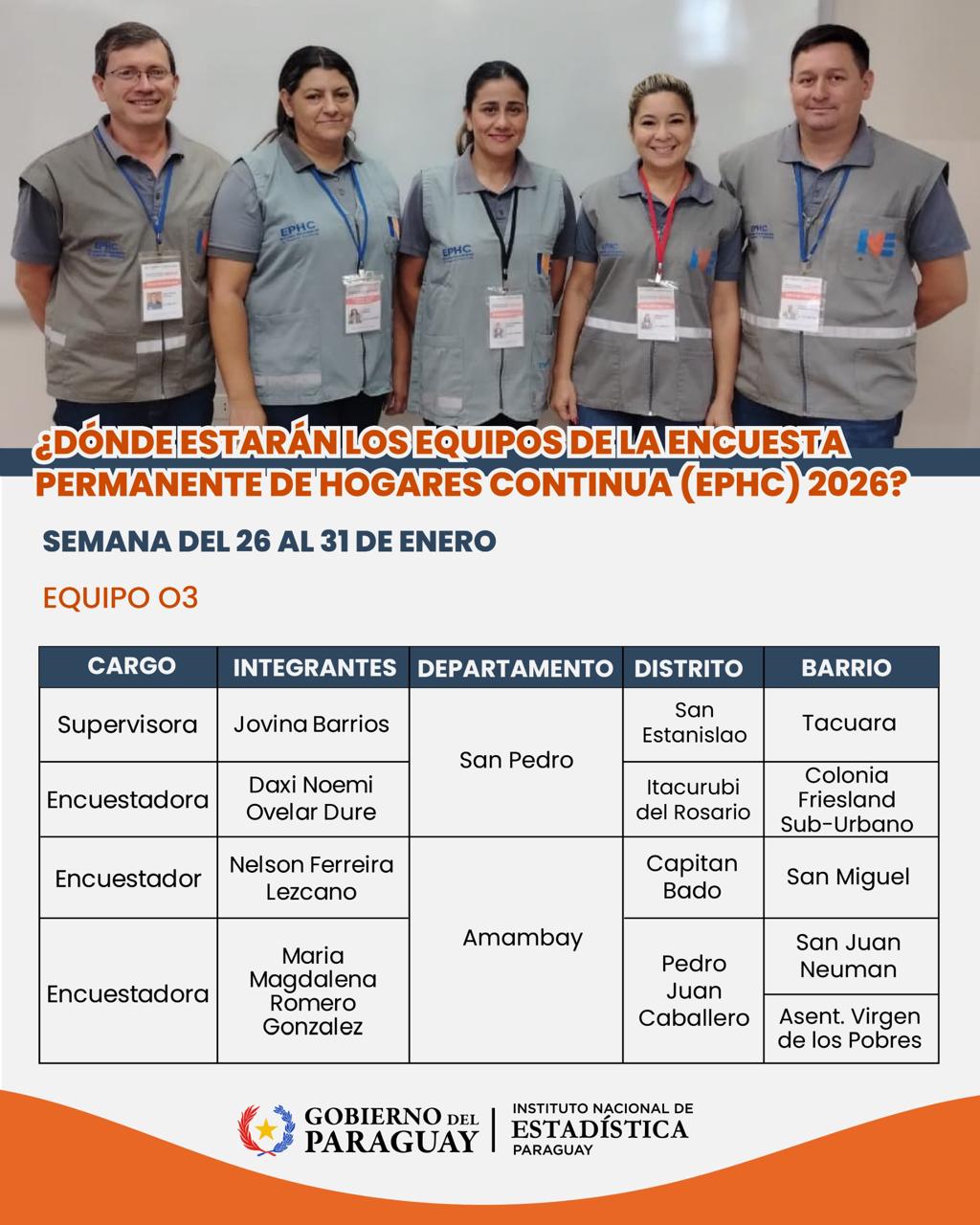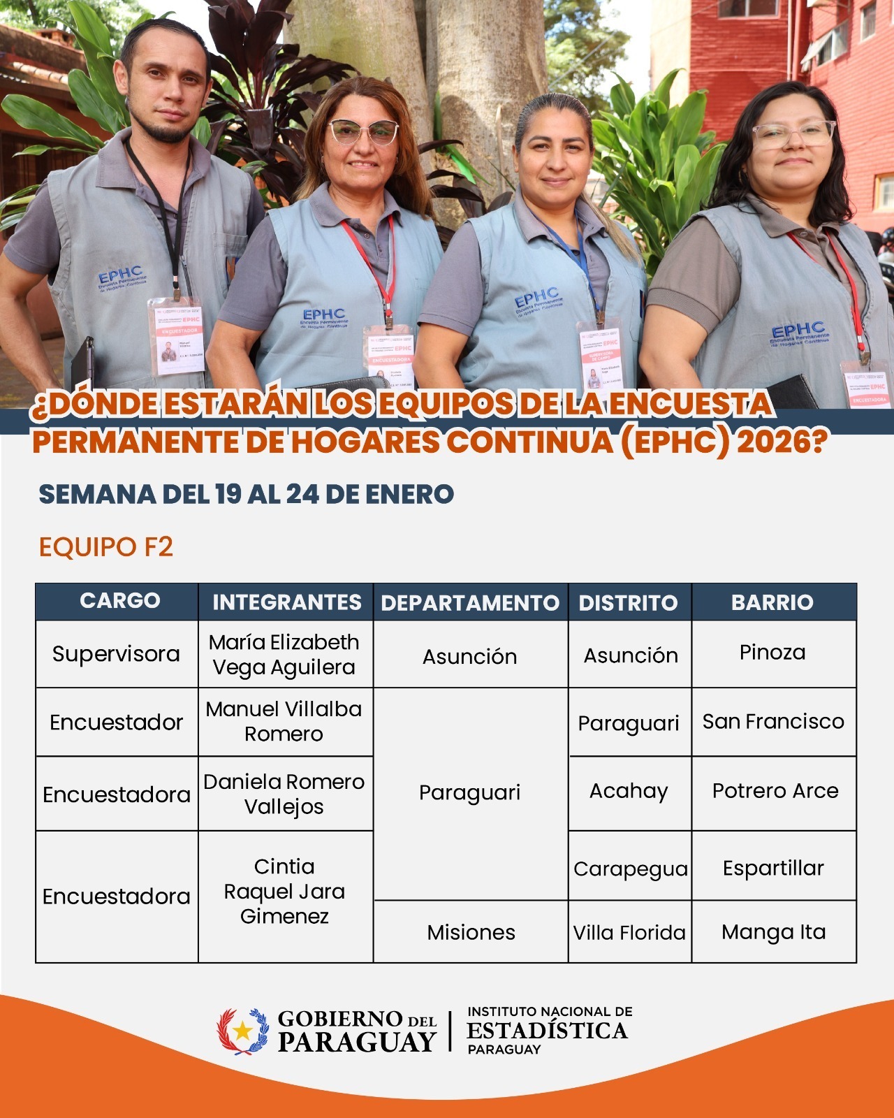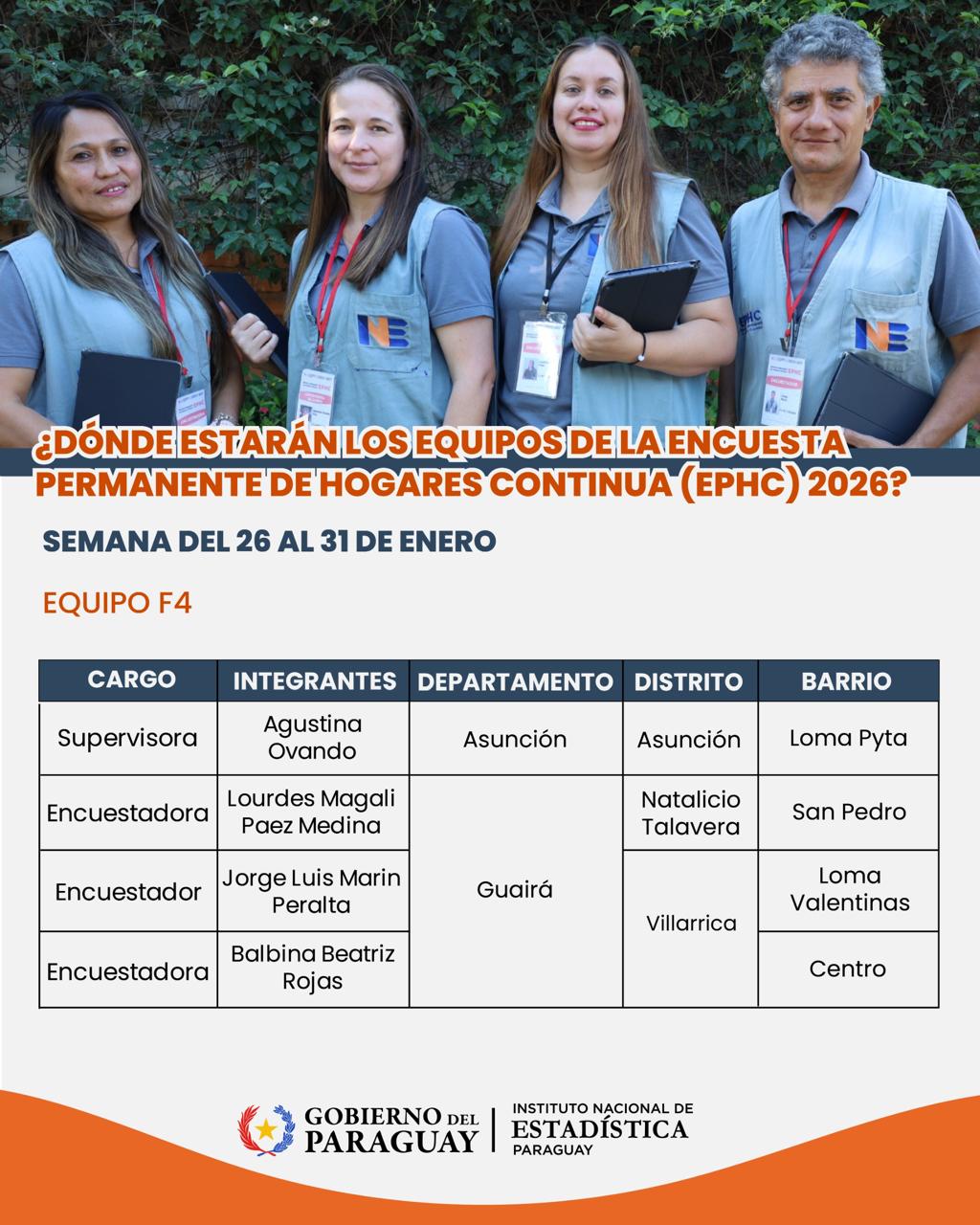 El Instituto Nacional de Estadística (INE) inició el operativo de campo para la recolección de datos del primer trimestre de la Encuesta Permanente de Hogares Continua (EPHC) 2026, que abarca los meses de enero, febrero y marzo. Cabe mencionar que este operativo se realiza durante todo el año.