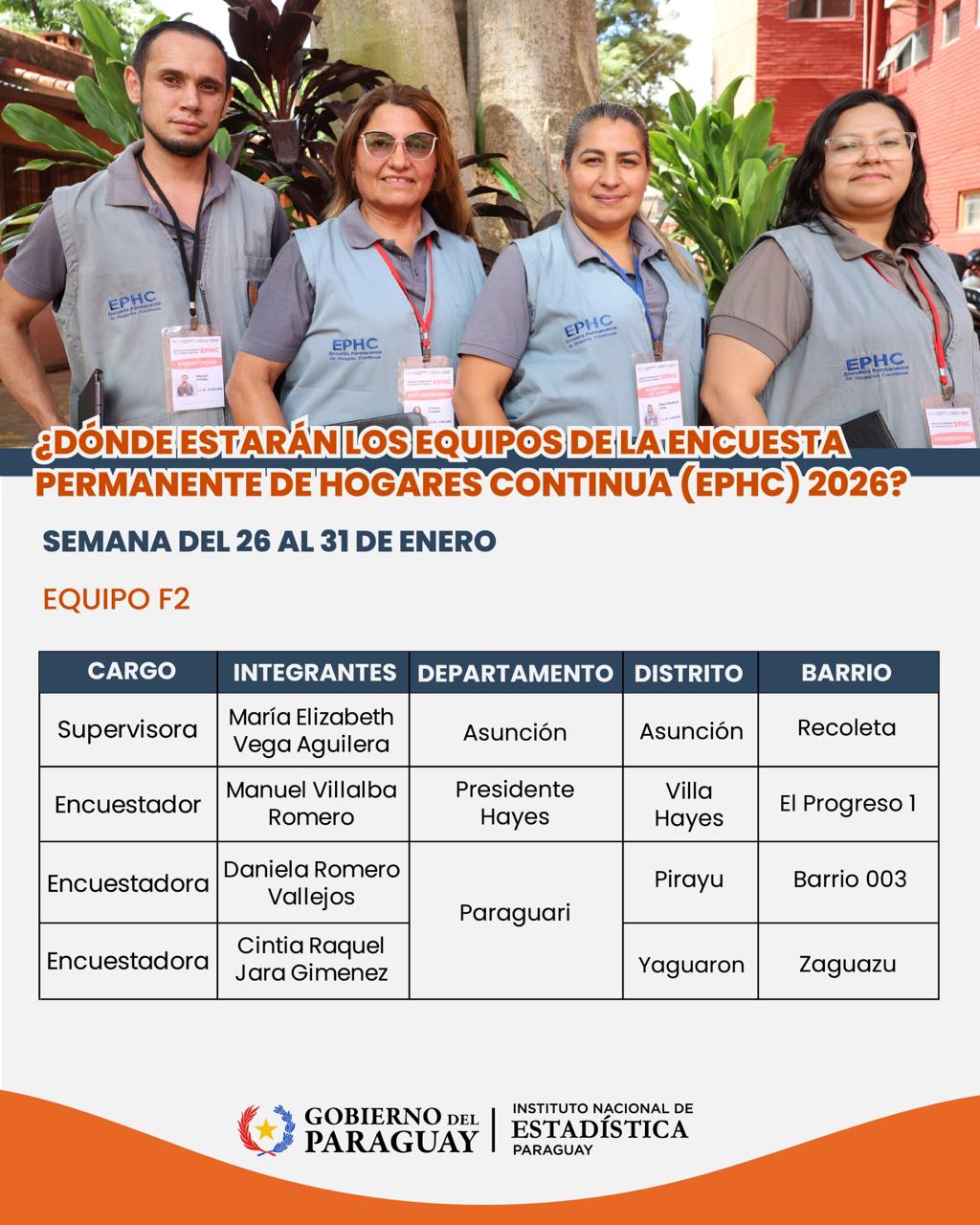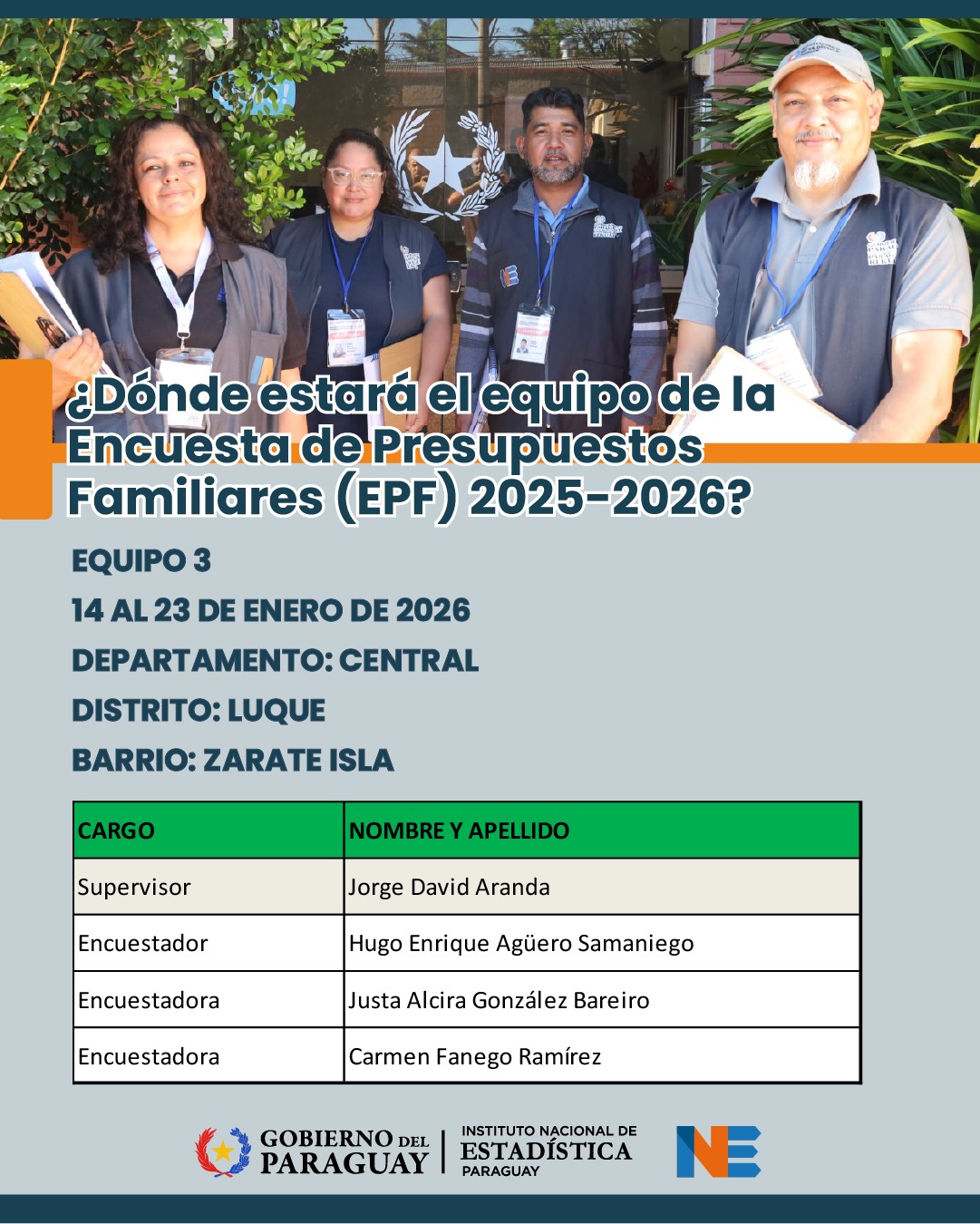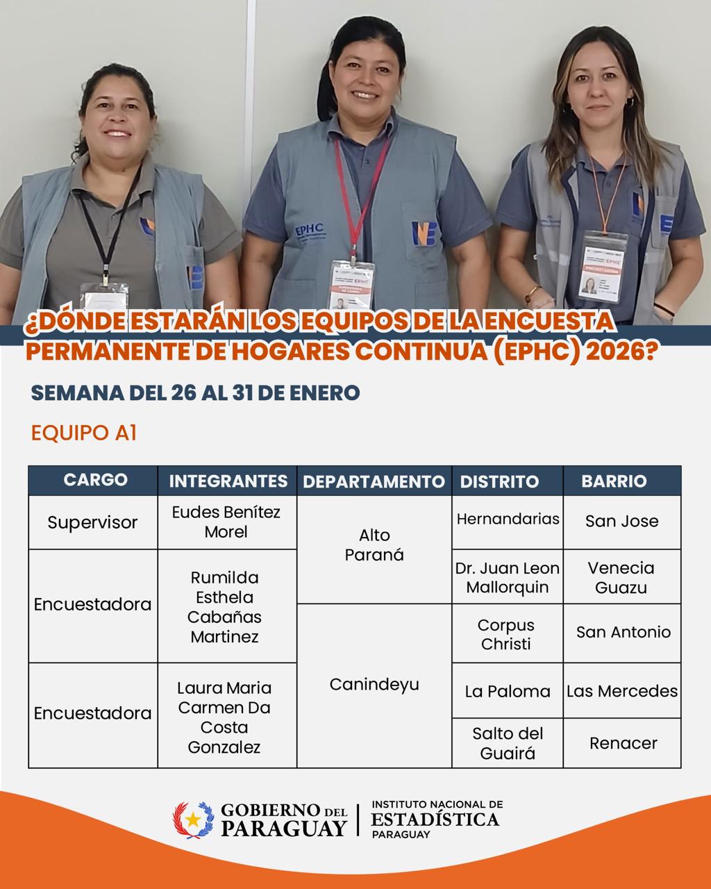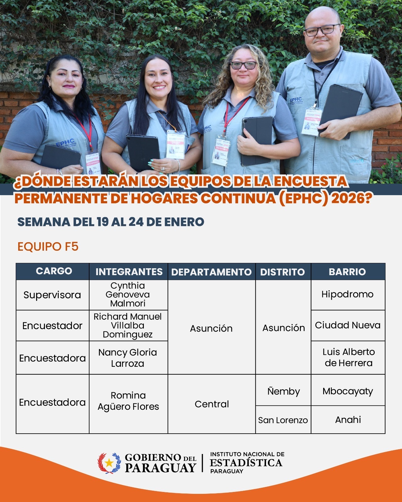 El Instituto Nacional de Estadística (INE) inició el operativo de campo para la recolección de datos del primer trimestre de la Encuesta Permanente de Hogares Continua (EPHC) 2026, que abarca los meses de enero, febrero y marzo. Cabe mencionar que este operativo se realiza durante todo el año.