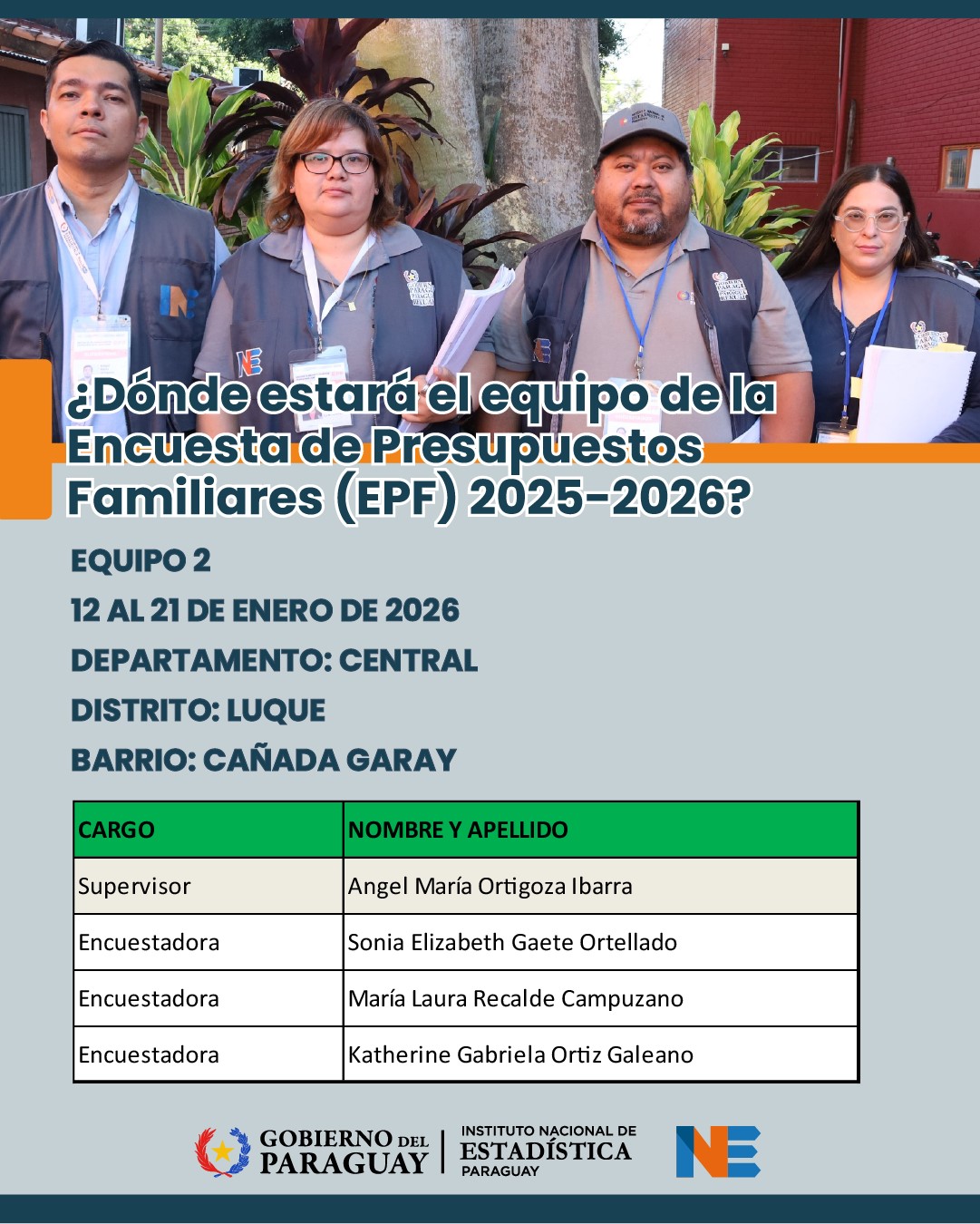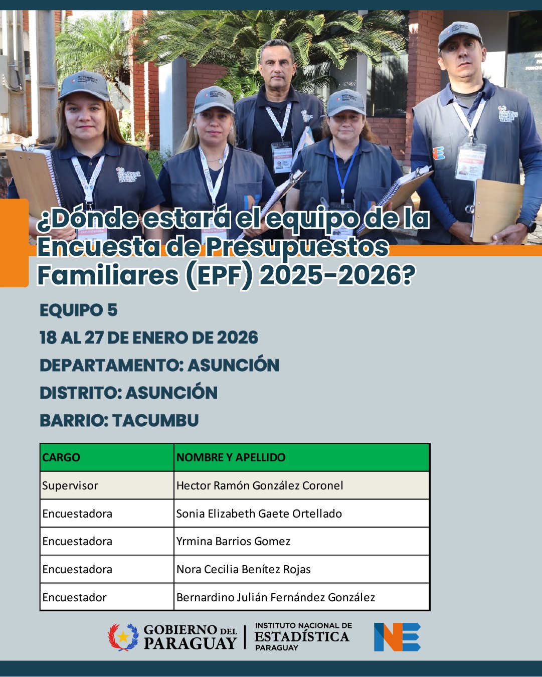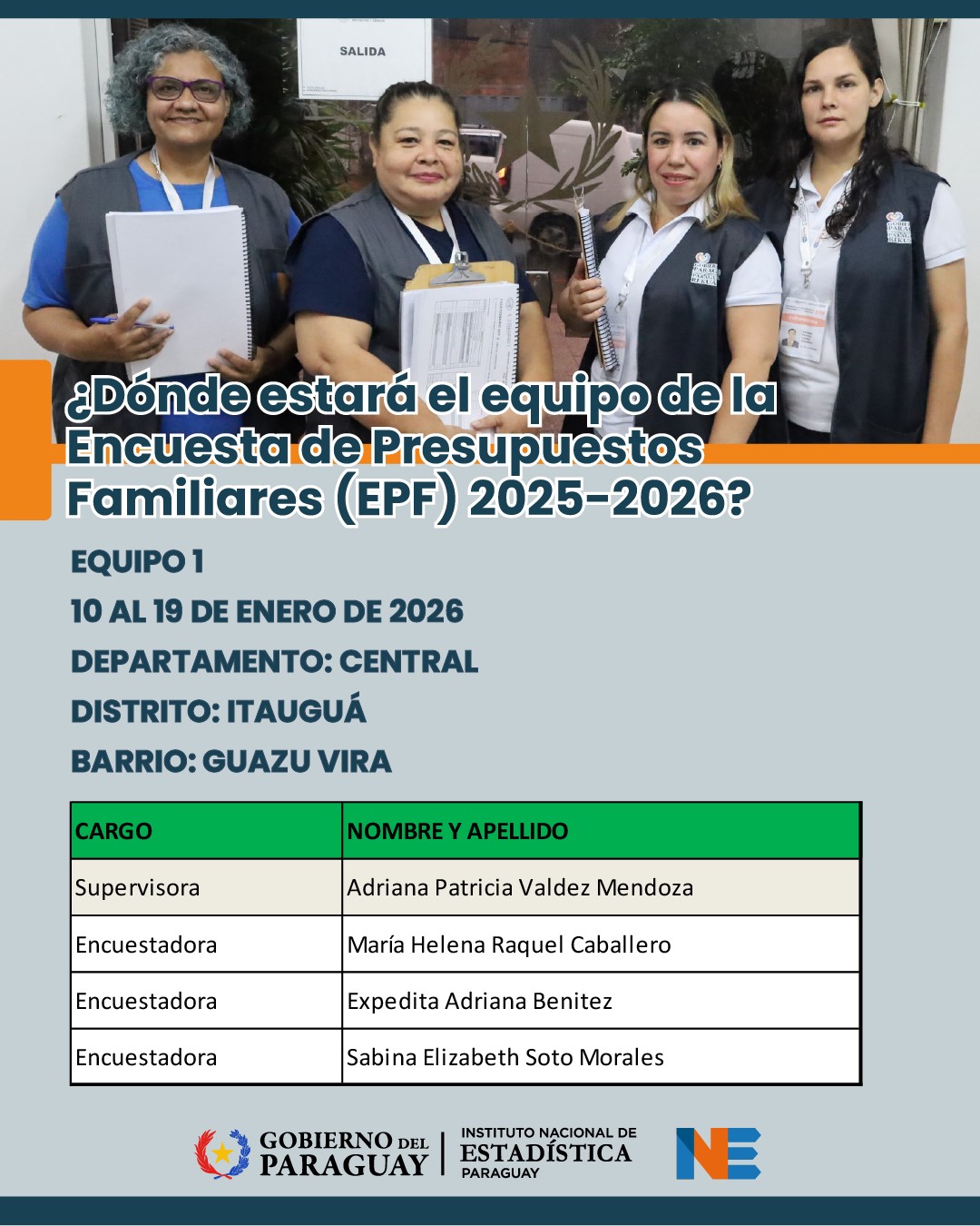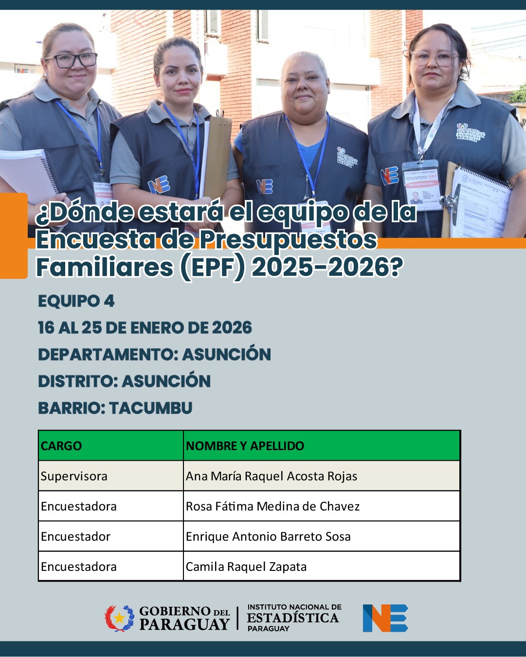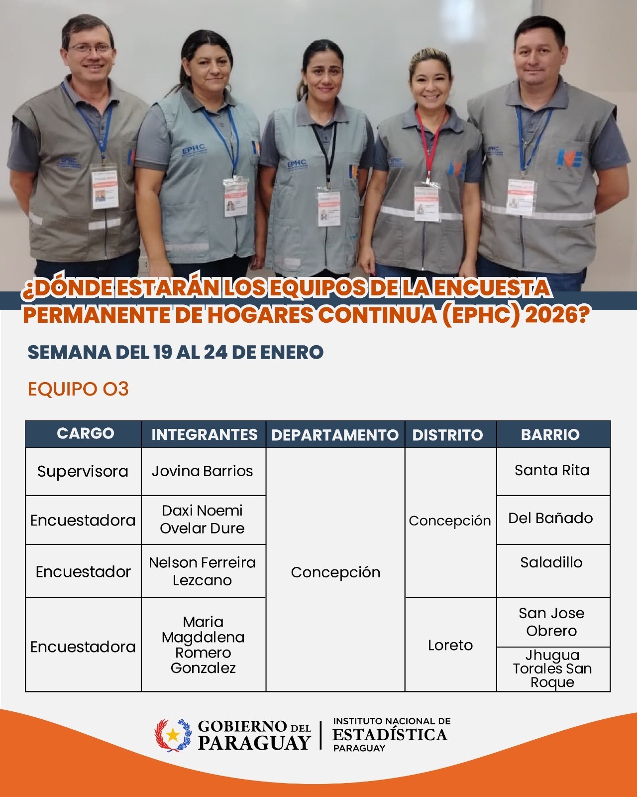 La Encuesta Nacional de Alimentación y Nutrición (ENAN) dará continuidad este domingo 25 de enero en el Departamento Concepción, abarcando las ciudades de Itacúa y Paso Barreto, el equipo de trabajo estará en el Departamento en la semana del domingo 25 al viernes 30 de enero del 2026. Este esfuerzo permitirá, tras aproximadamente seis décadas, contar con información actualizada, representativa y de alta calidad sobre la situación alimentaria y nutricional de la población paraguaya.