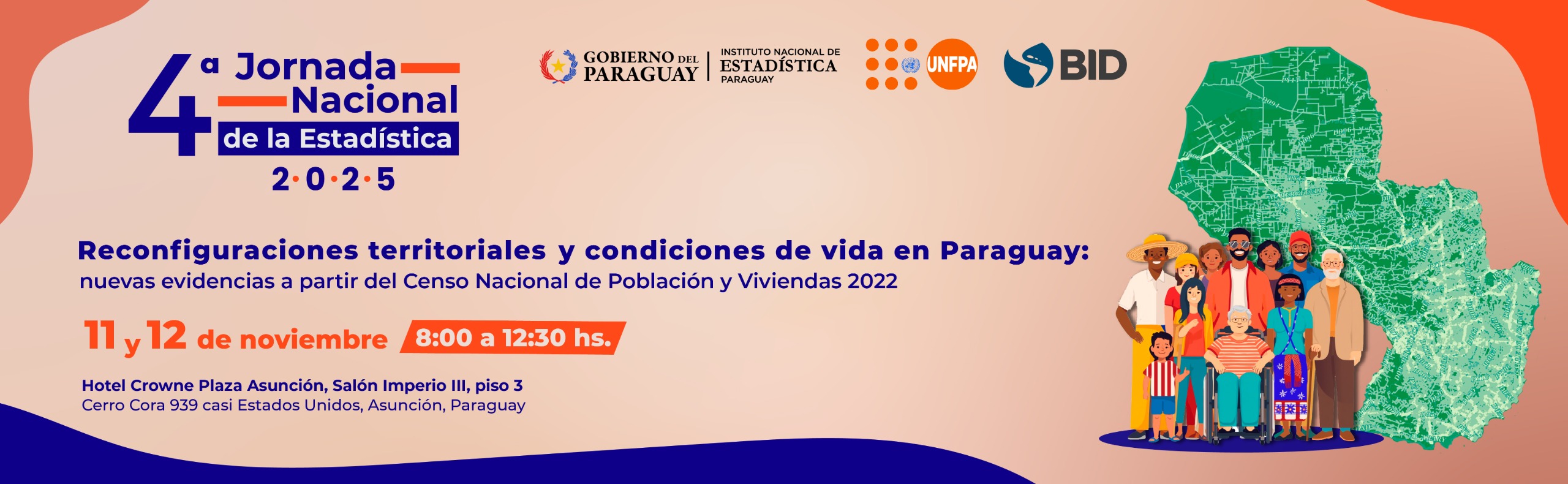El Instituto Nacional de Estadística (INE) y el Fondo de Población de las Naciones Unidas (UNFPA), con el apoyo del Banco Interamericano de Desarrollo (BID), organizan la 4° Jornada Nacional de Estadística, titulada “Reconfiguraciones territoriales y condiciones de vida en Paraguay: nuevas evidencias a partir del Censo Nacional de Población y Viviendas (CNPV) 2022”.