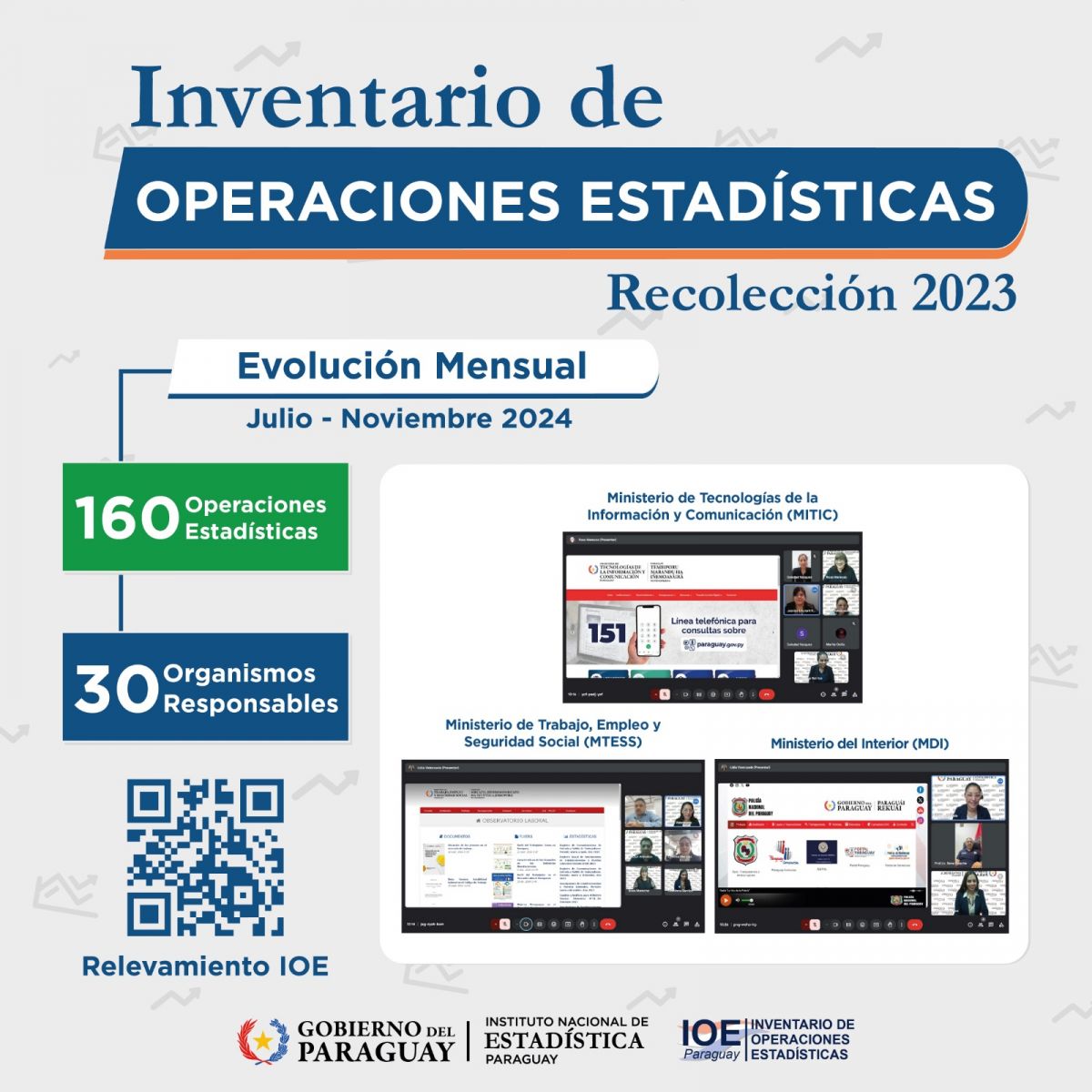 El relevamiento del IOE se realiza anualmente a través del sistema web INE/IOE y se incorporan progresivamente las operaciones estadísticas que son identificadas. Entre los meses de julio – noviembre de este año se ha recolectado 160 Operaciones Estadísticas (OE) correspondientes a 30 Organismos Públicos.