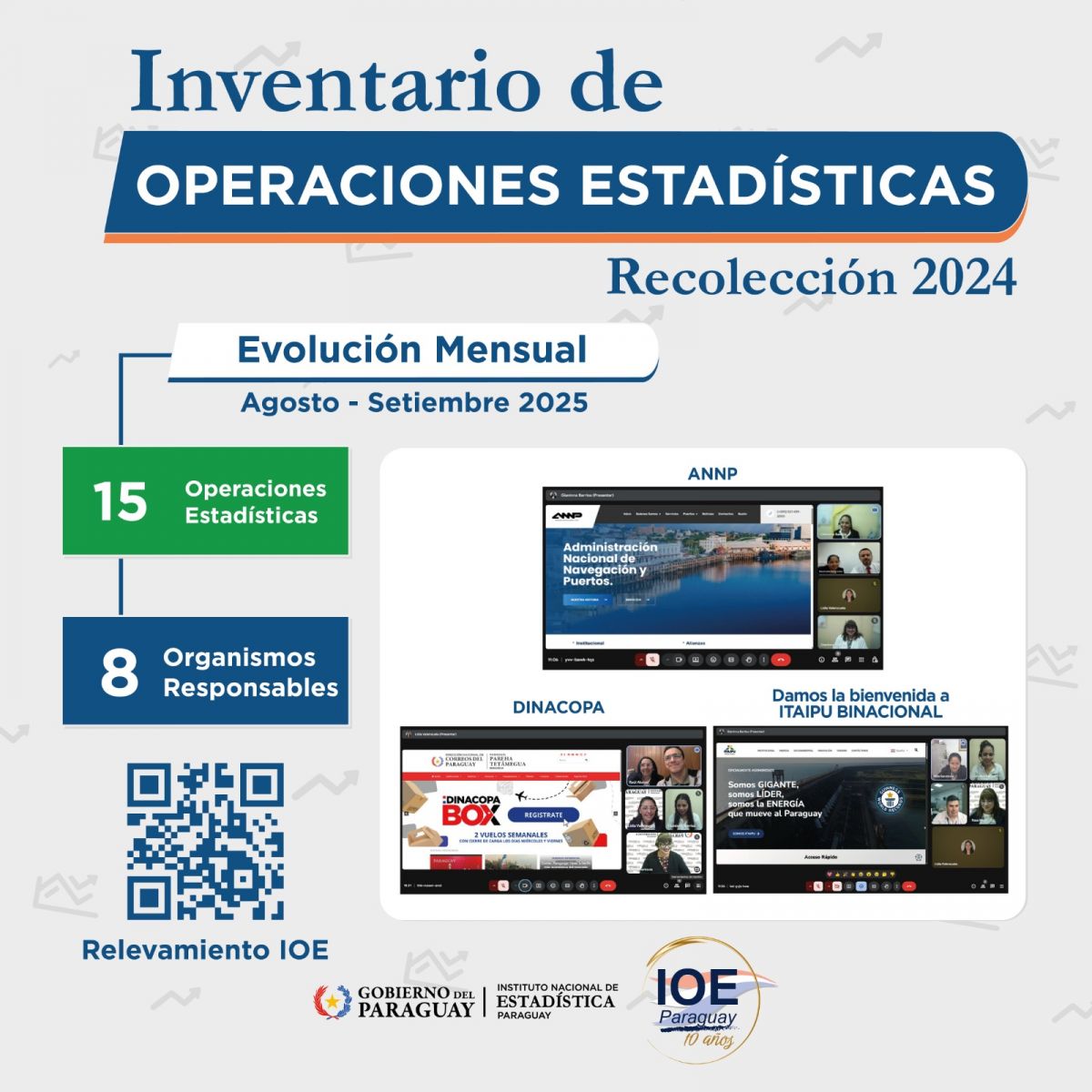 El relevamiento del IOE se realiza anualmente a través del sistema web INE/IOE y se incorporan progresivamente las operaciones estadísticas que son identificadas. Entre los meses de agosto – septiembre de este año se ha recolectado 15 Operaciones Estadísticas (OE) correspondientes a 8 Organismos Públicos.