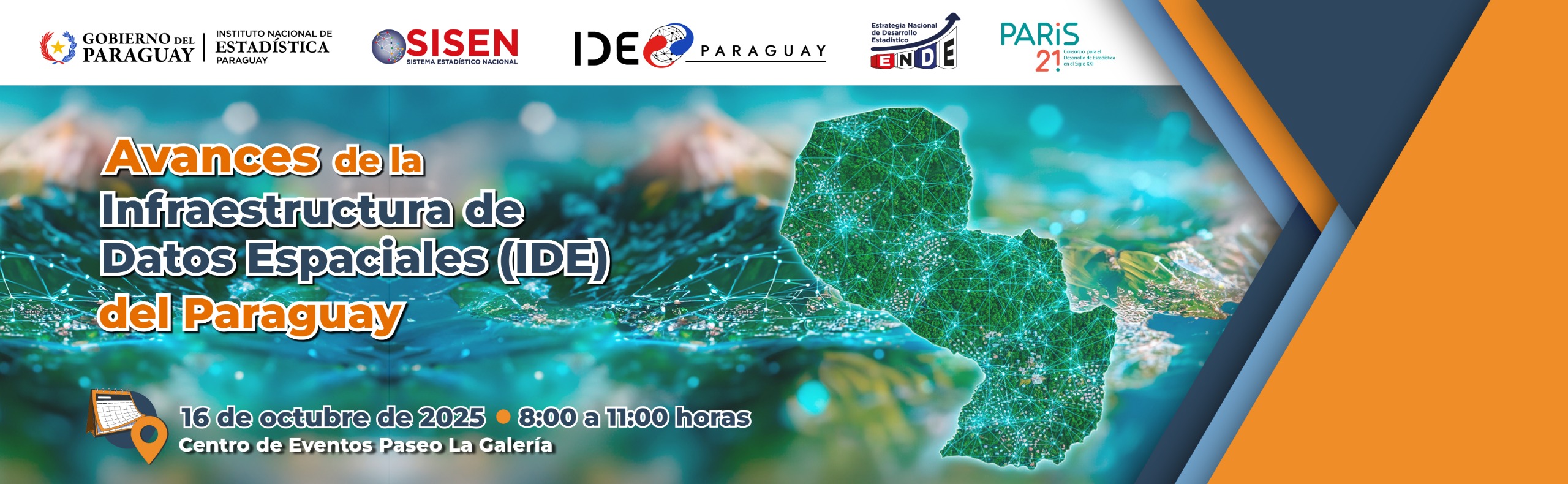 El Instituto Nacional de Estadística (INE), junto a la Agencia Espacial del Paraguay (AEP), la Dirección del Servicio Geográfico Militar (DISERGEMIL) y el apoyo de la organización PARIS21, presentará los avances de la Infraestructura de Datos Espaciales del Paraguay (IDE Paraguay), en el marco de la reunión anual de seguimiento de la Mesa Técnica Interinstitucional. El encuentro se realizará este jueves 16 de octubre de 2025, de 7:30 a 11:00, en el Centro de Eventos del Paseo La Galería.
