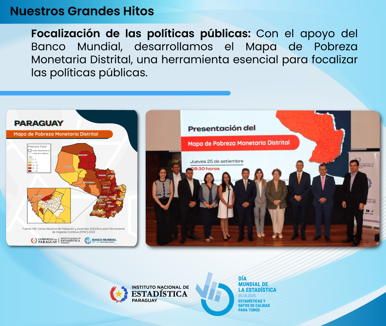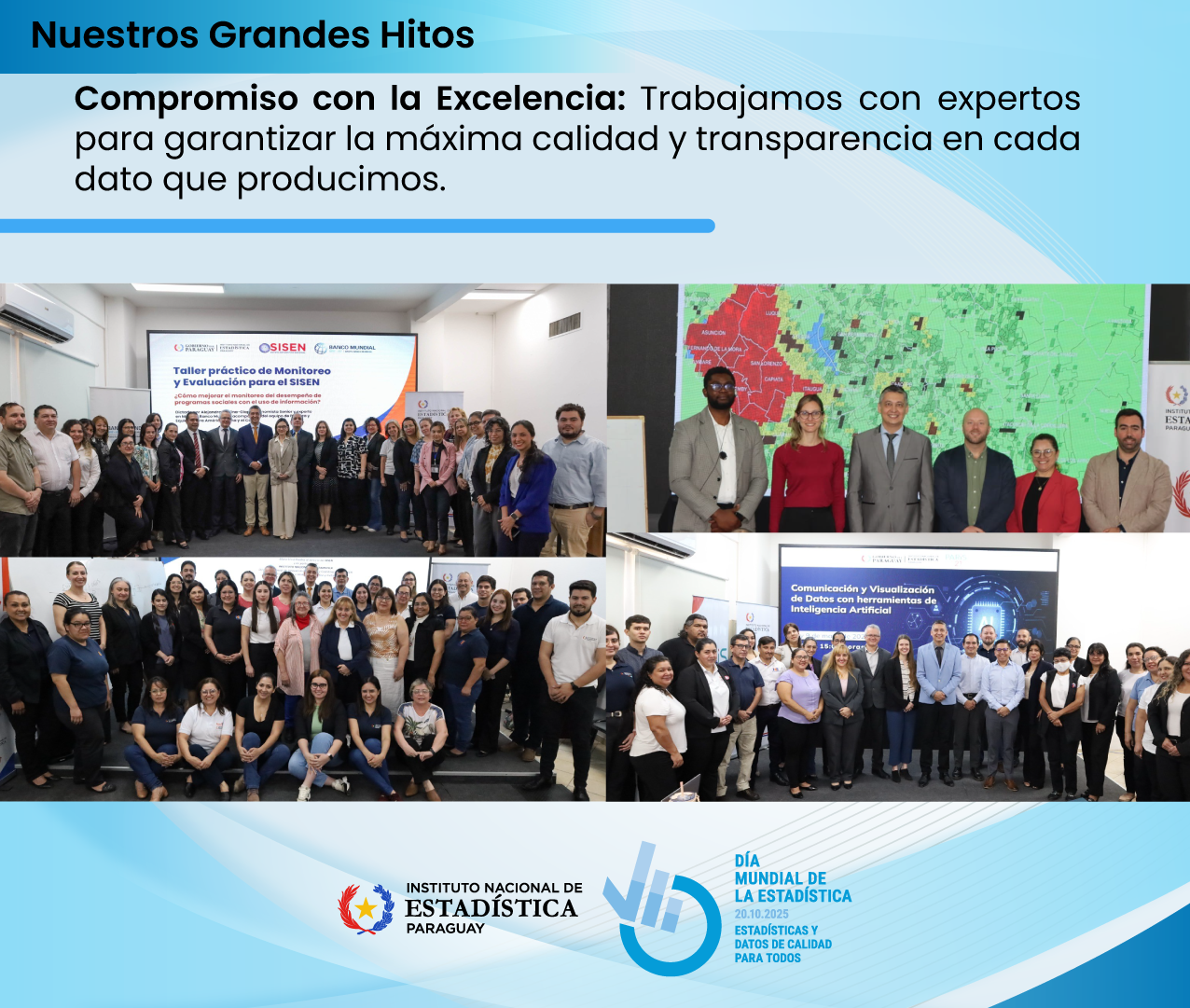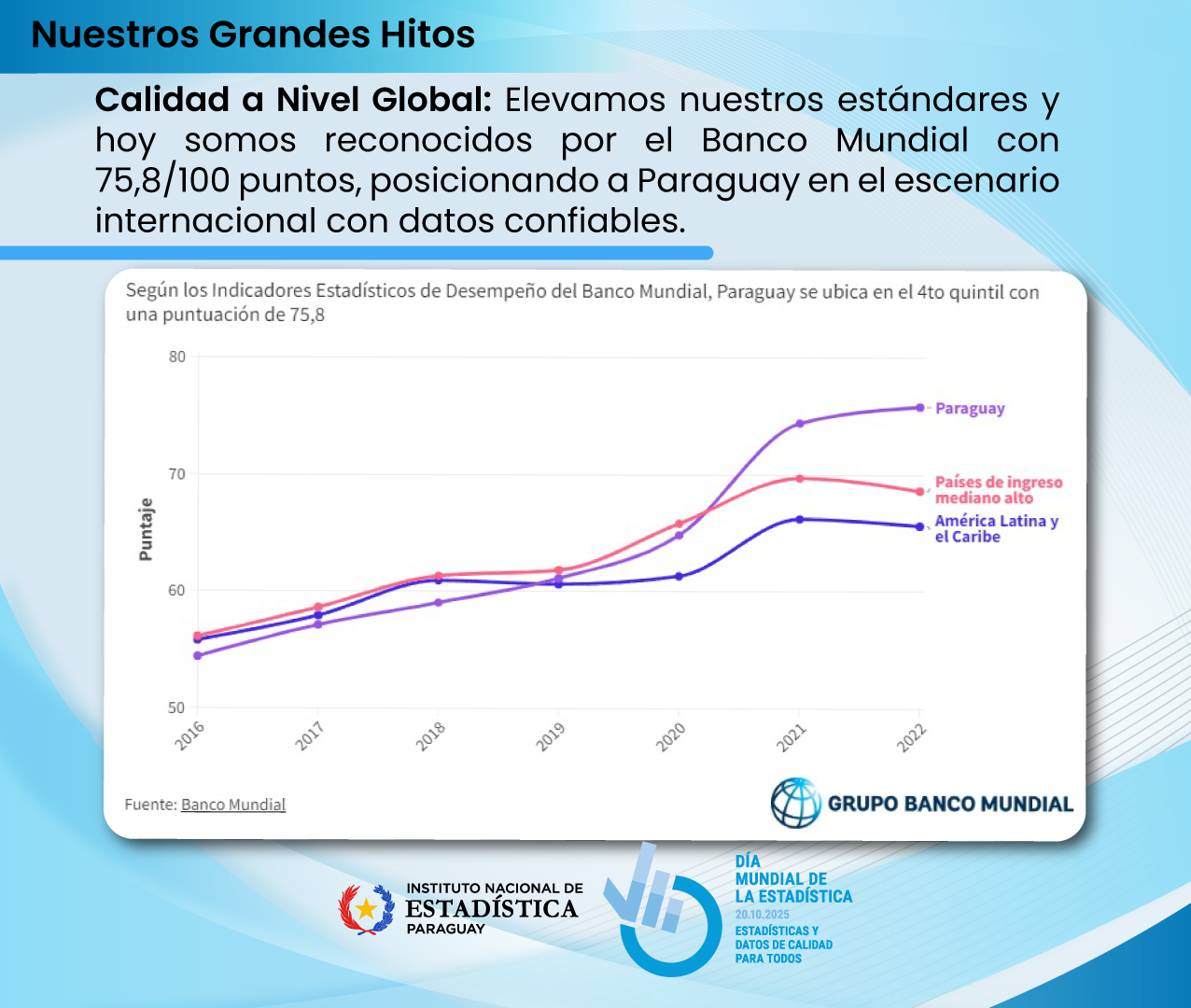 El compromiso del INE con la excelencia ha sido reconocido internacionalmente. El Banco Mundial otorgó a Paraguay 75,8/100 puntos en desempeño estadístico, superando a la media latinoamericana y la de países de renta media.