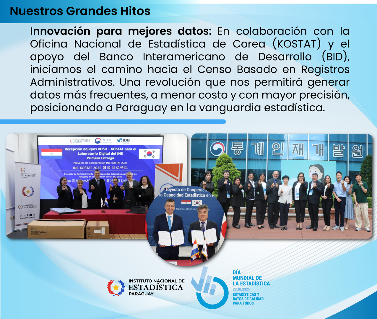 Mirando hacia el futuro, el INE, en colaboración con la Oficina Nacional de Estadística de Corea (KOSTAT) y el apoyo del Banco Interamericano de Desarrollo (BID), avanza hacia un Sistema Integrado de Registros Administrativos, que sentará las bases del futuro Censo basado en Registros Administrativos, una innovación que permitirá datos más frecuentes y precisos a menor costo, posicionando a Paraguay en la vanguardia estadística.