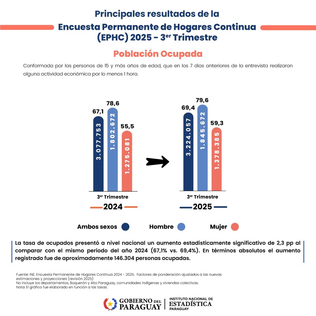 La cantidad de ocupados en el 3er trimestre del año 2025 fue alrededor de 3.224.057 personas, 69,4% de la población de 15 y más años de edad. En comparación al mismo periodo del año 2024, a nivel nacional la tasa de ocupación registró un aumento estadísticamente significativo de 2,3 puntos porcentuales (67,1% vs. 69,4%). En términos absolutos, representó un aumento de aproximadamente 146.304 personas ocupadas.