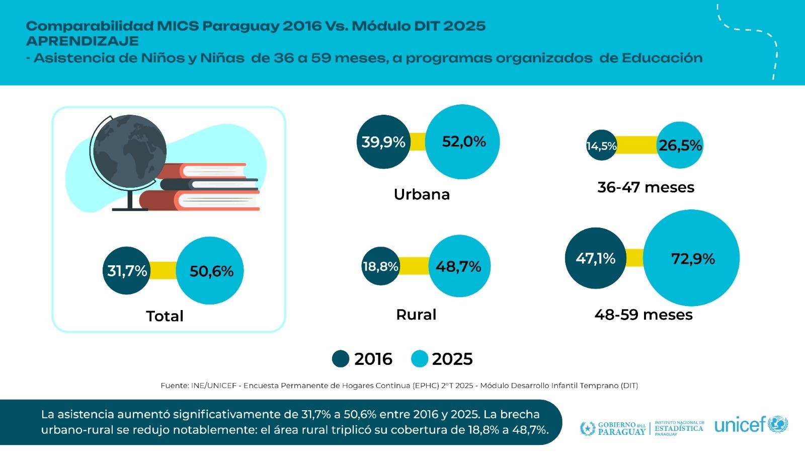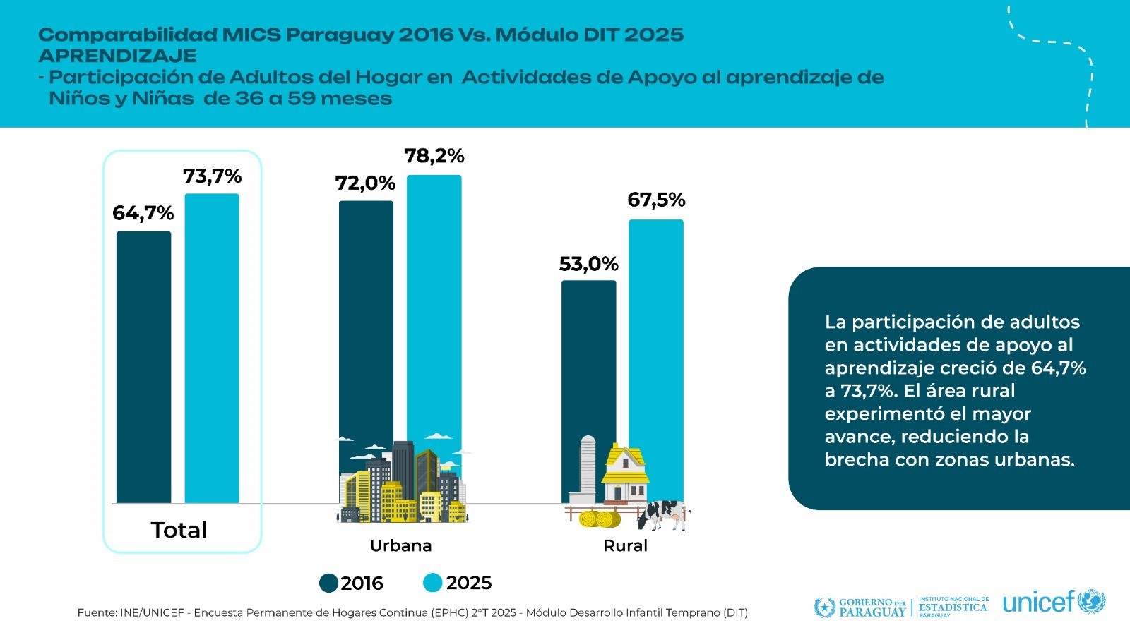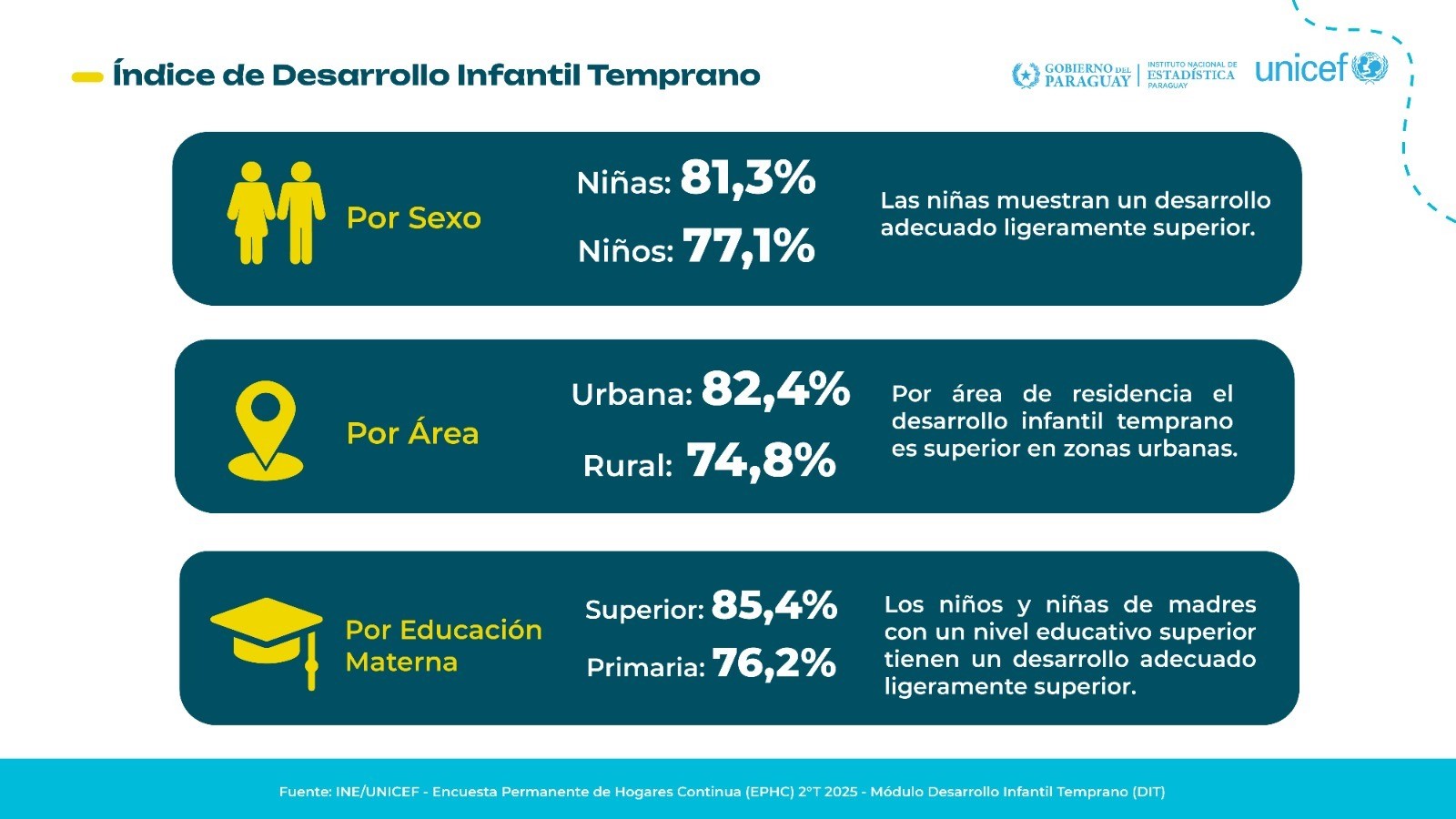 El Instituto Nacional de Estadística (INE) y el Fondo de Naciones Unidas para la Infancia (UNICEF) presentaron información actualizada sobre el Desarrollo Infantil Temprano en Paraguay, resultados que provienen de un módulo aplicado en la Encuesta Permanente de Hogares Continua (EPHC) durante el segundo trimestre del año 2025.