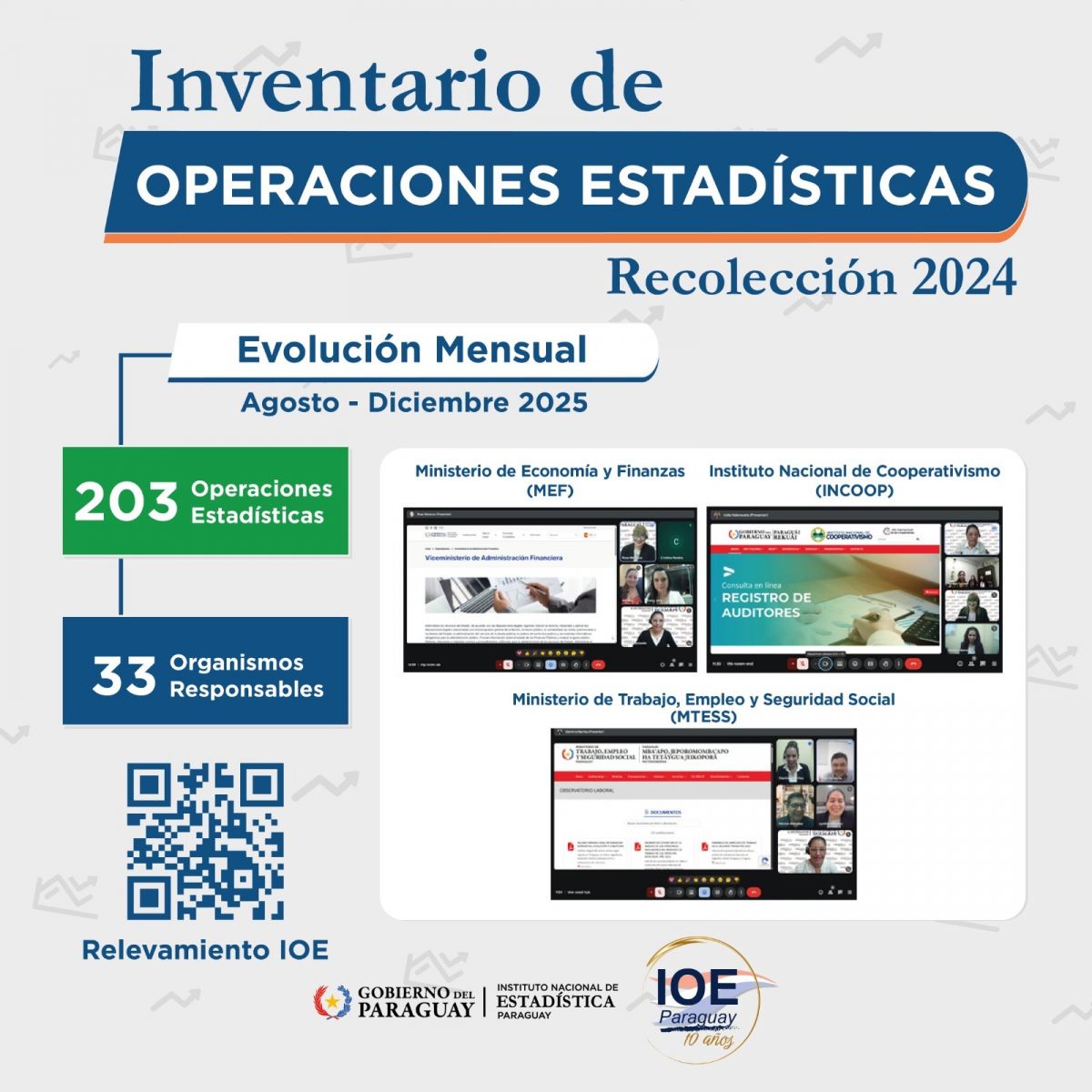 El relevamiento del IOE se realiza anualmente a través del sistema web INE/IOE y se incorporan progresivamente las operaciones estadísticas que son identificadas. Entre los meses de agosto – diciembre de este año se ha recolectado 203 Operaciones Estadísticas (OE) correspondientes a 33 Organismos Públicos.
