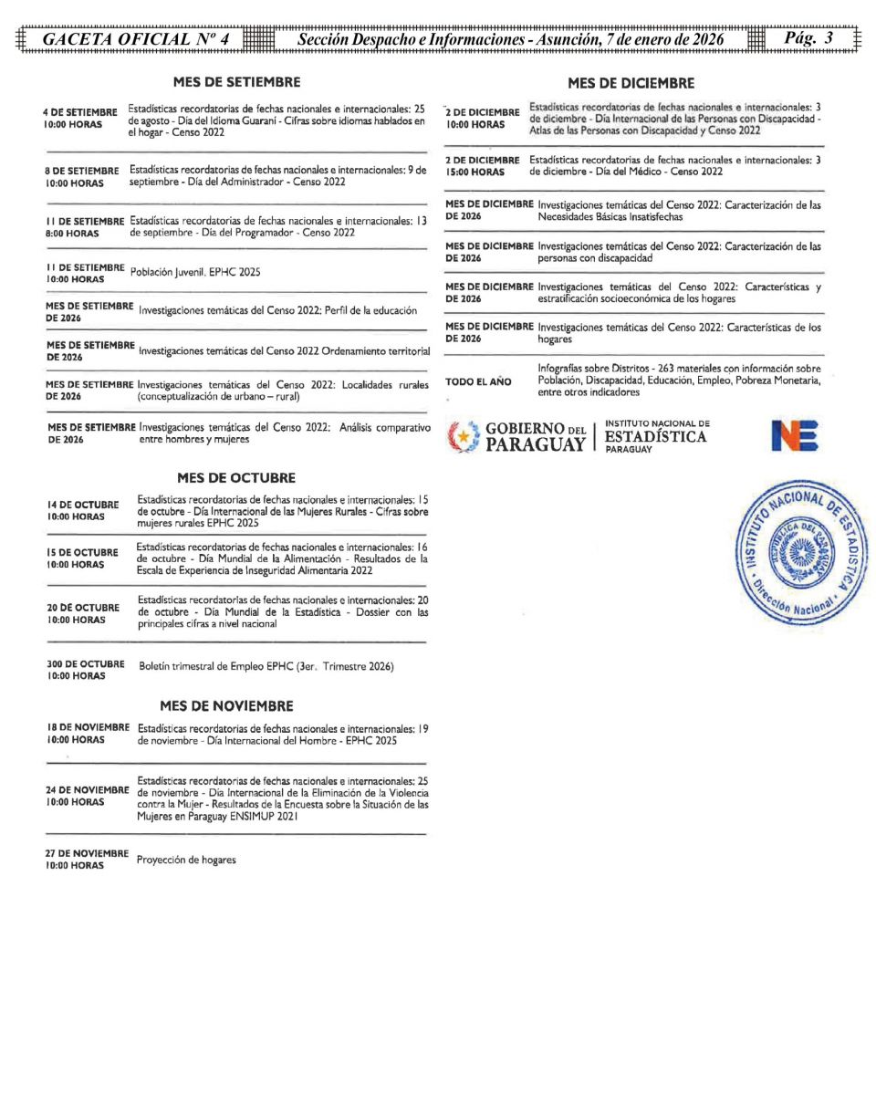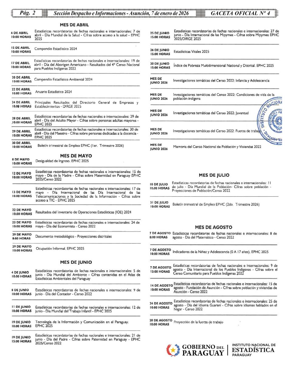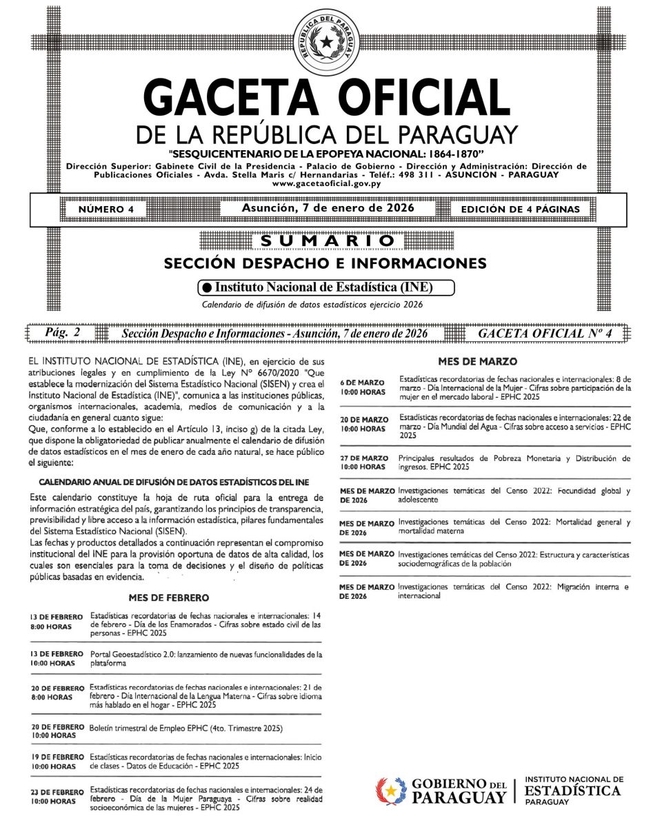 El Calendario de Difusión de Datos Estadísticos del ejercicio 2026 del Instituto Nacional de Estadística (INE) fue publicado hoy en la Gaceta Oficial de la República del Paraguay, en cumplimiento a las normas de independencia técnica y buenas prácticas estadísticas vigentes.