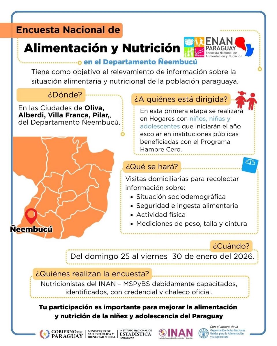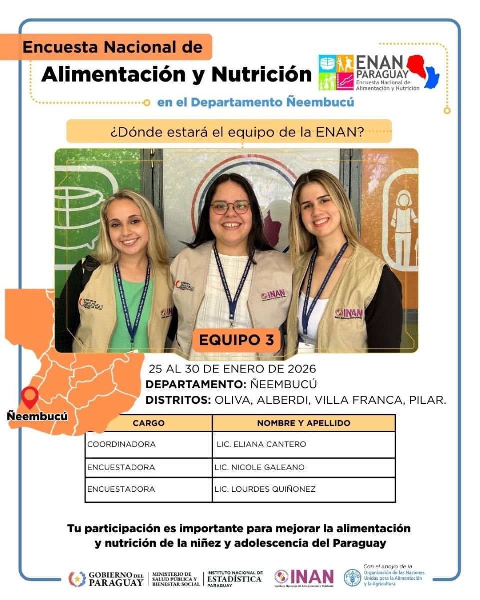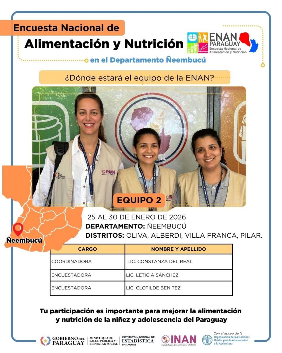 La Encuesta Nacional de Alimentación y Nutrición (ENAN) dará continuidad este domingo 25 de enero en el Departamento Ñeembucú, abarcando las ciudades de Oliva, Alberdi, Villa Franca y Pilar, el equipo de trabajo estará en el Departamento en la semana del domingo 25 al viernes 30 de enero del 2026. Este esfuerzo permitirá, tras aproximadamente seis décadas, contar con información actualizada, representativa y de alta calidad sobre la situación alimentaria y nutricional de la población paraguaya.