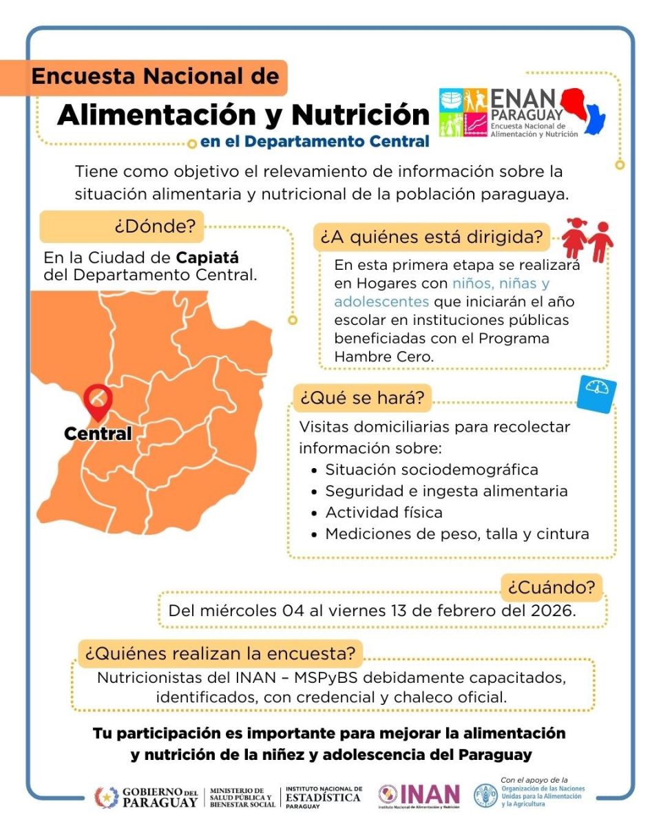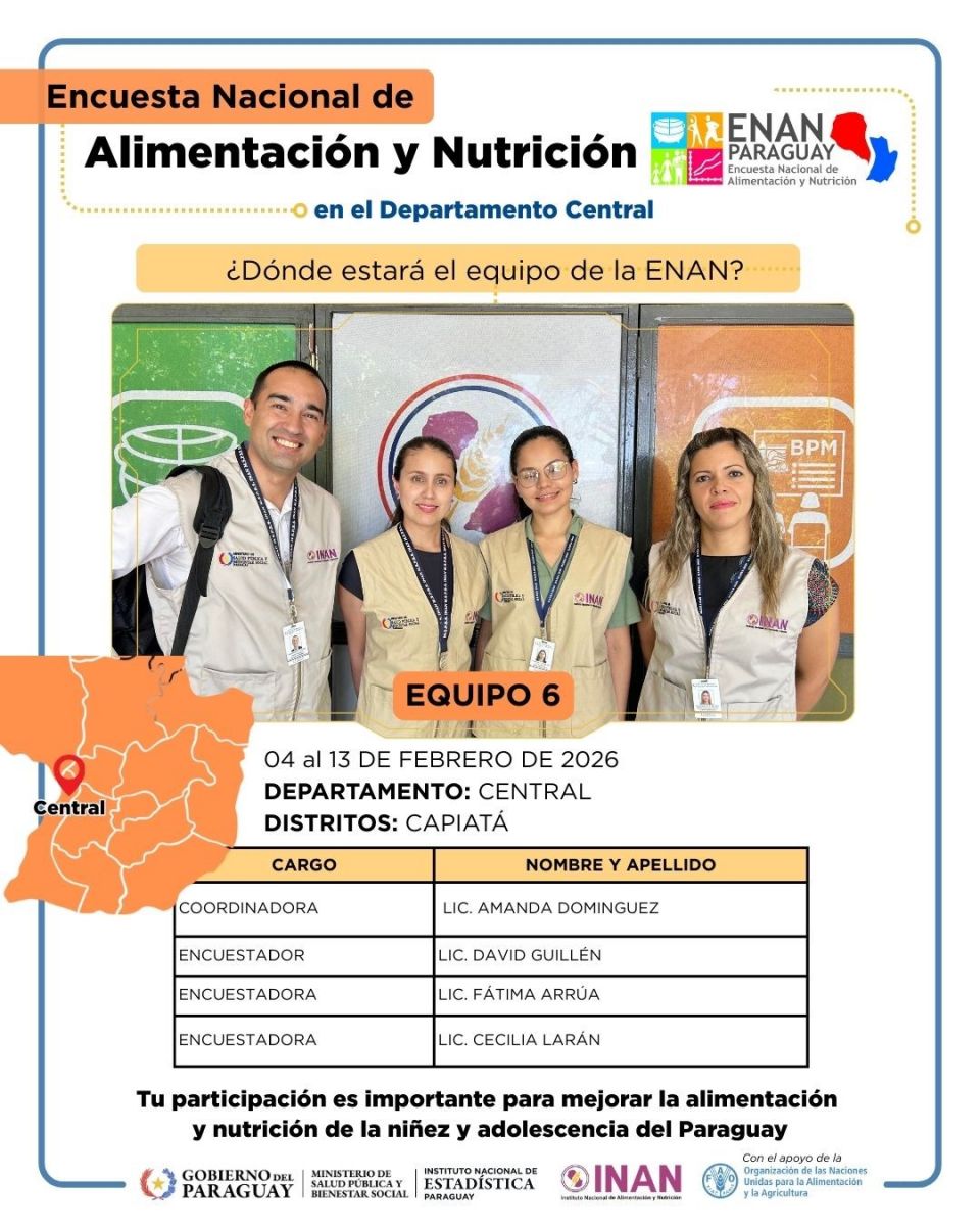 La Encuesta Nacional de Alimentación y Nutrición (ENAN) se desarrollará nuevamente en el Departamento Central, el equipo de trabajo estará en la Cuidad Capiatá del miércoles 04 al viernes 13 de febrero del 2026.