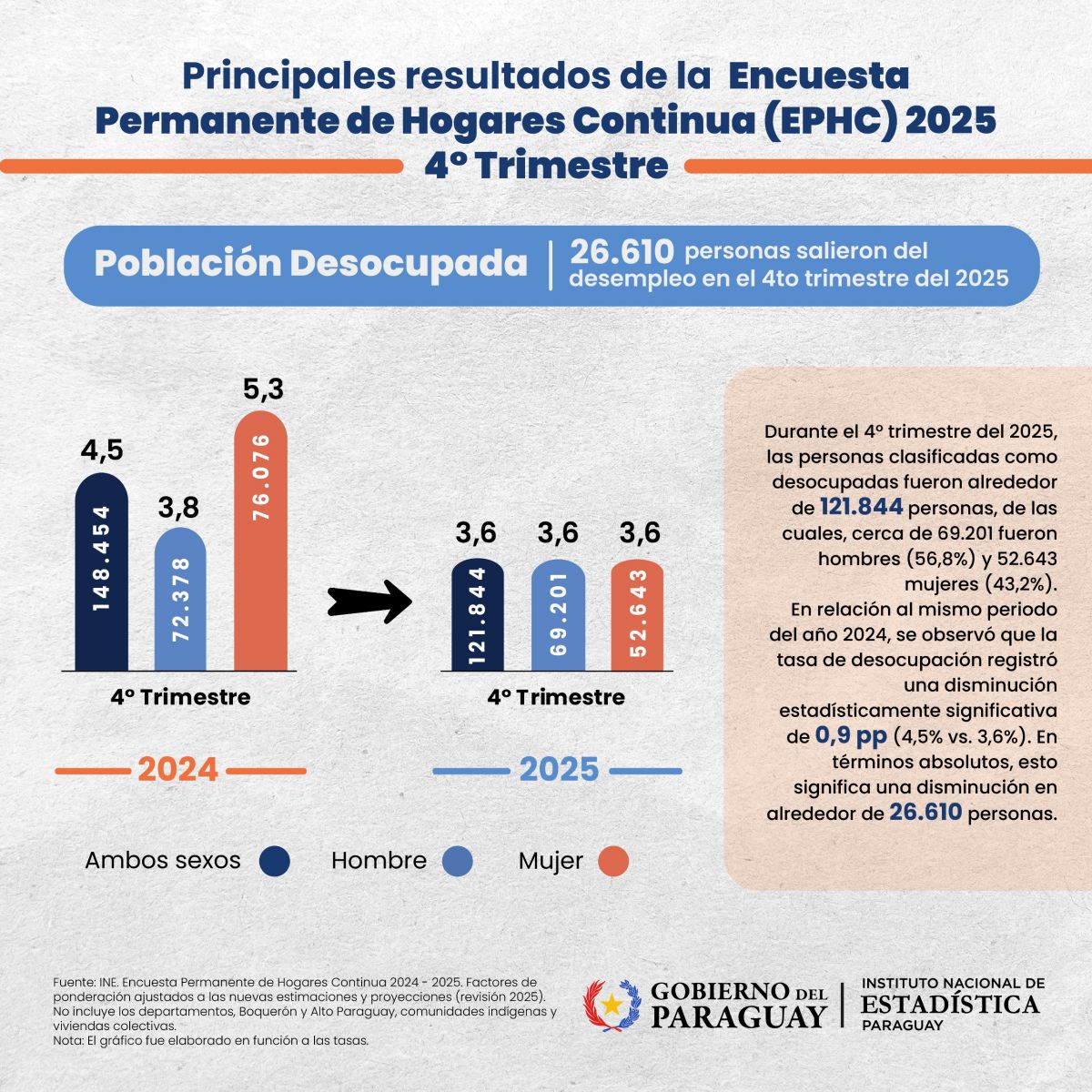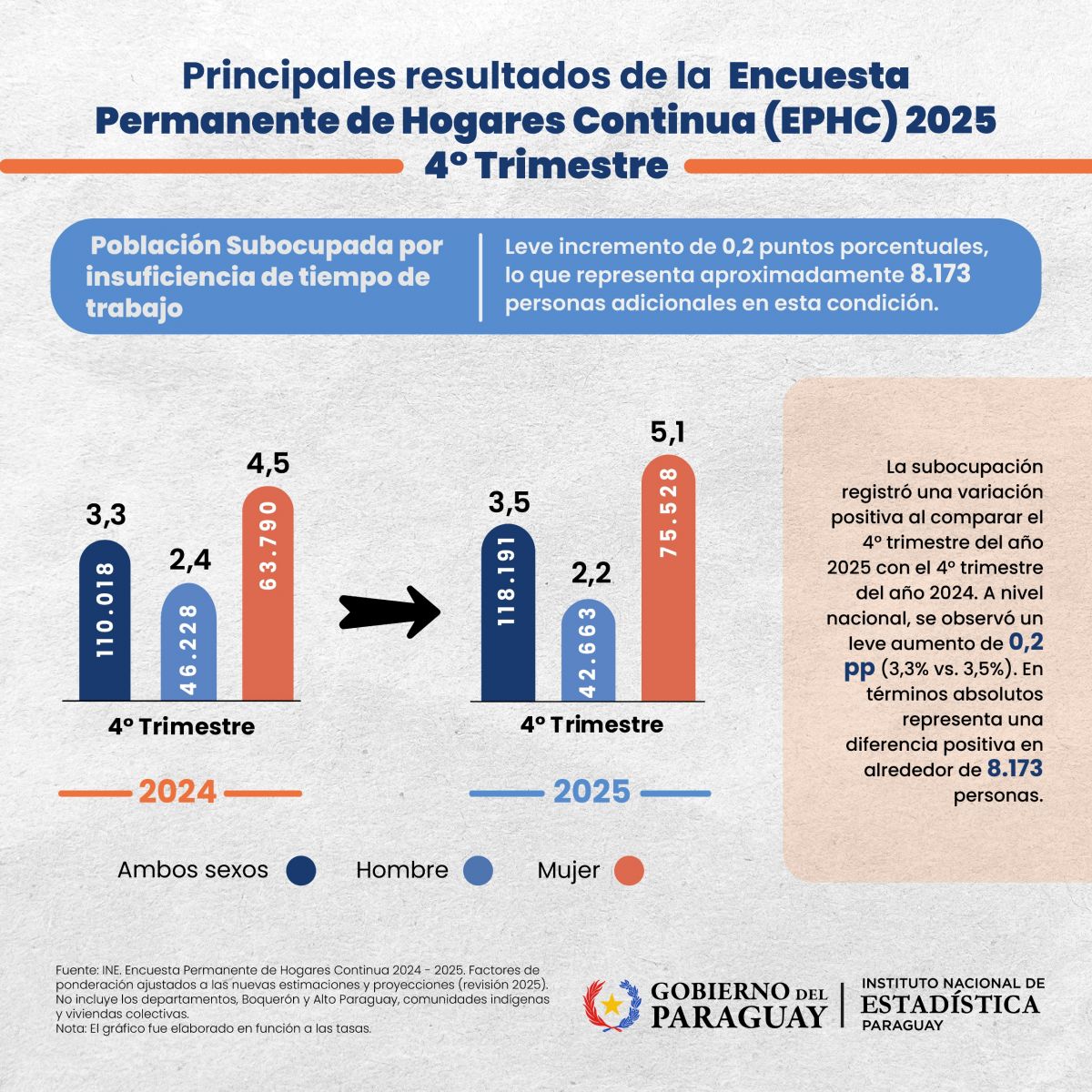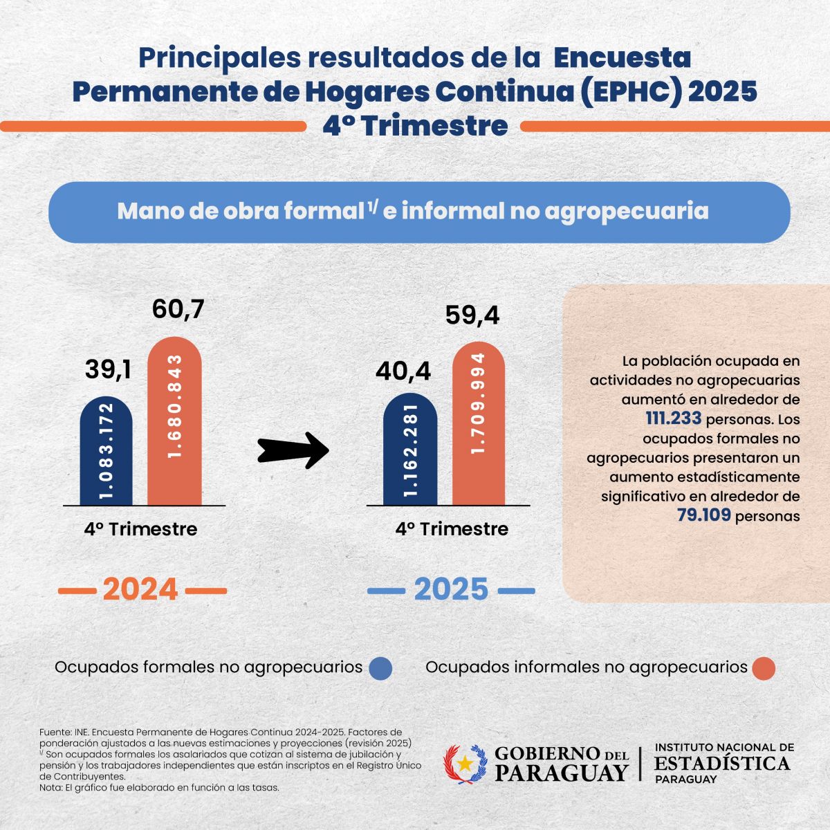 El Instituto Nacional de Estadística (INE) dio a conocer los principales resultados del comportamiento del mercado laboral, a partir de la Encuesta Permanente de Hogares Continua (EPHC) 2025, correspondiente al cuarto trimestre.